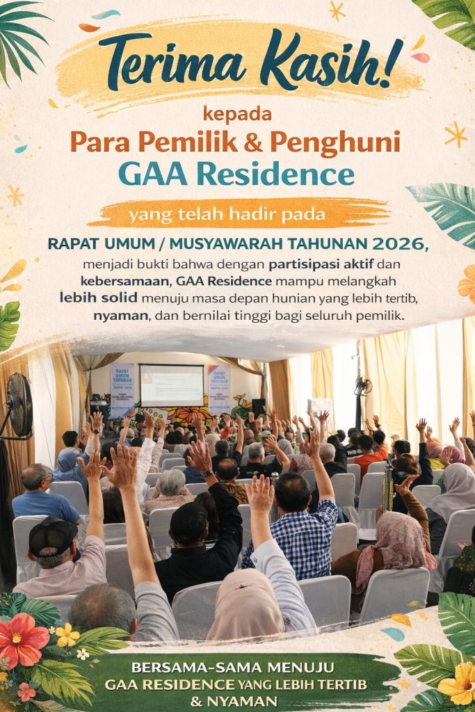 RUTA 2026 menjadi bukti bahwa dengan partisipasi aktif dan kebersamaan, GAA Residence mampu melangkah lebih solid menuju masa depan hunian yang lebih tertib, nyaman, dan bernilai tinggi bagi seluruh pemilik.