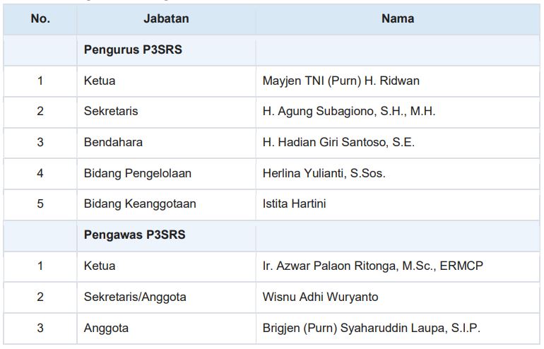Pada posisi tertinggi dalam kepengurusan terdapat Mayjen TNI (Purn) H. Ridwan yang menjabat sebagai Ketua P3SRS. Ketua memiliki peran strategis dalam memimpin organisasi, menetapkan kebijakan, serta mengoordinasikan seluruh kegiatan pengelolaan dan pelayanan kepada pemilik dan penghuni.